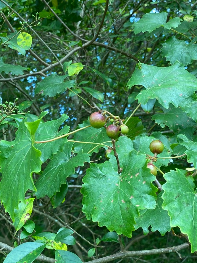 God isn’t finished with me yet when it comes to carpentry, gardening, or being a mechanic. He may bless me with the opportunities to learn those things quite soon. Who knows? Maybe never. However, I love watching vegetables and fruits grow. Last week, I was doing my weekly mowing on the tractor ( Oh, once again, our Brother in Christ, Lloyd Thieman, has been our tractor savior this year!!! ) , and I drove under some of the infamous privet hedges that are 10 feet tall. Dangling from the hedges were muscadine vines with muscadines!  Some were even turning purple! While dodging privet branches I yelled only to God , “Muscadines already?” , and I could hear God (Not God’s literal voice , of course… I’m not Pentecostal yet) saying, “Yes, Haven. ALREADY.” This thought gave me the theme of this entry. After I parked the tractor in the barn that evening, I took my phone and snapped photos of our muscadines, pears, and black walnuts.