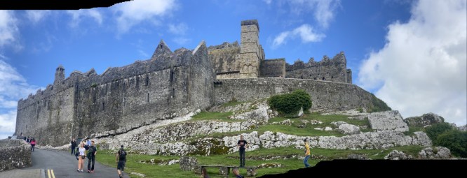 Our last traveling day across Ireland found us in Cashel and Cahir Ireland. The two towns are just 11 miles apart, but it took over 2 hours to get there from Dublin Airport. It was our second and final car rental while we were in Ireland. Since Cousin Beth Stoker, Mike, Ben and Bradley had visited the Rock of Cashel summer of 2022, we wanted to go. The limestone rock that appears as a mountain rising above the plains of Tipperary is quite impressive. The pre Christian, Celtic pagans used the hill for worship and other rituals before one of my favorite, Christian, historical figures, St. Patrick, preached to them on this very hill. St. Patrick then baptized their King Angus, and converted the area people to Christianity from this very spot. I was a bit disappointed that the Cashel Gothic cathedral is in ruins and St. Patrick’s cross was a replica. We weren’t even allowed to see the original cross. However, Cashel’s Romanesque church that is/was attached to the Gothic cathedral is intact. It is called Cormac’s Chapel, and its sculptures, arches, and frescoes are classic Romanesque. The extraordinary Irish added their own “signature” to Romanesque art with its high pitched roof. The round tower and the Celtic cross-laden cemetery helped add to the extremely Irish-Celtic spirit of our travel day.