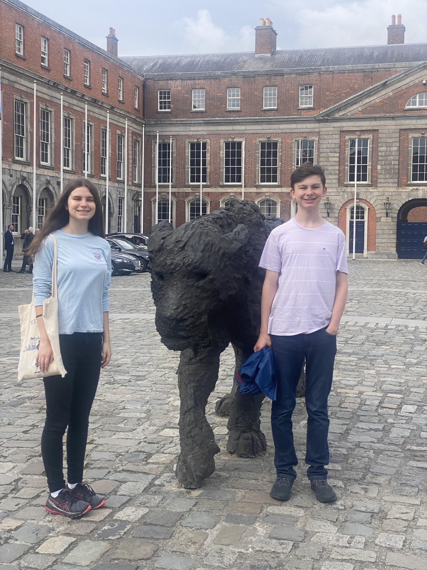 A tour of Dublin Castle, however, is not free. The name “Dublin Castle” sounds a bit deceiving, right? Or, to Haven, Dublin Castle’s one, Medieval-style tower lends the idea of the Middle Ages. However, 95 % of the castle is Georgian in architecture. Dublin’s original, medieval castle is underground. When the majority of the Norman Castle burned in 1684, only one Medieval tower remained and city architects decided the complex would be rebuilt in “modern architecture” what was then, of course, Georgian – the British time period of the 4 King Georges of Great Britain 1714-1837. Some of you know that I am a language nerd, sooooooo ….. Dublin is Old-Irish Gaelic “Dubh Linn”. It means Black Pool. Unbeknownst to the general public, there is a river under Dublin Castle and the streets as well. The river is the River Poddle. Through hundreds of years, the river was rerouted around and under Dublin structures as it flows to the River Liffey. When the Middle Ages people created a fortress on the spot of today’s Dublin Castle the River Liffey and River Poddle were almost converging on that spot. Standing on concrete surrounded by 20th & 21st Century buildings you have NO IDEA about these things. Dublin Castle is so proud of an exhibition from Rome, Italy, so we snapped a few shots. Italy’s Davide Rivalta’s bronze lioness roams in the upper courtyard of Dublin Castle. The piece is part of an exhibition, called Grazing in Lucan, & is a collaboration between Rome’s National Gallery of Modern and Contemporary Art and Dublin Castle.