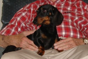 The evening I first saw Buddy he was already spoiled. Buddy had already been eating people food (fried chicken, bacon, cubed steak, whatever Ray had fixed for himself that he shared with Buddy), tried to sleep in Ray’s huge, king-sized bed but didn’t know quite what to do since he had slept outside probably on a chain for a year, but Buddy already felt LOVED. Buddy would not stop springing up to our knees showing his delight for whatever kindness we showed him. It was dark that evening, but I took him for a walk around Ray’s neighborhood. Ray was using an oxygen tank 24/7, and it was difficult for him take Buddy out frequently. Oh, yes, Buddy… he didn’t have his name yet. From the time I met Ray late 2003, his #1 nickname for Sean was “Buddy”. After Buddy had been with Ray for a few days, Sean mentioned to his dad that “Buddy” would be an easy name for Ray to remember. Ray loved the idea, and it didn’t take long for our intelligent little dachshund to recognize his name.